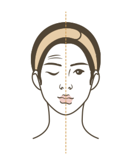 얼굴신경이 뇌에서 빠져 나온 이후의 경로에 이상이 발생하며 마비. 얼굴 위, 아래 모두 한쪽으로 마비가 오는 벨마비(Bell’s paisy)라고 합니다. 이마에 주름을 잡을 수 없고, 눈을 감을 수 없습니다. 얼굴마비 외에 눈물이 감소되거나 음식 맛을 느끼지 못하는 증상이 동반될 수 있고, 청력의 소실은 없지만, 소리가 비정상적으로 크게 들리기도 합니다.