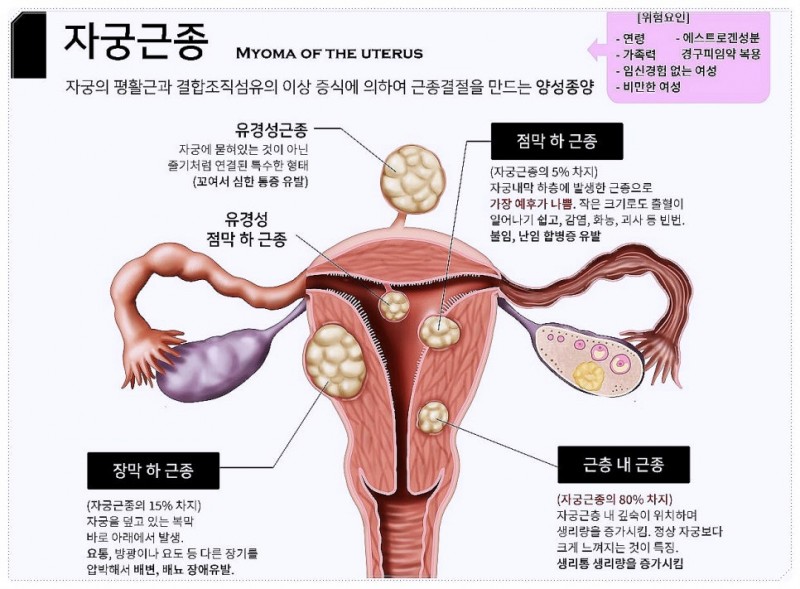 특히 **자궁 내막 근처(점막하근종)**에 위치하면 자궁내막에 직접 영향을 줘서 과다출혈이나 월경 불순이 생기기도 합니다.