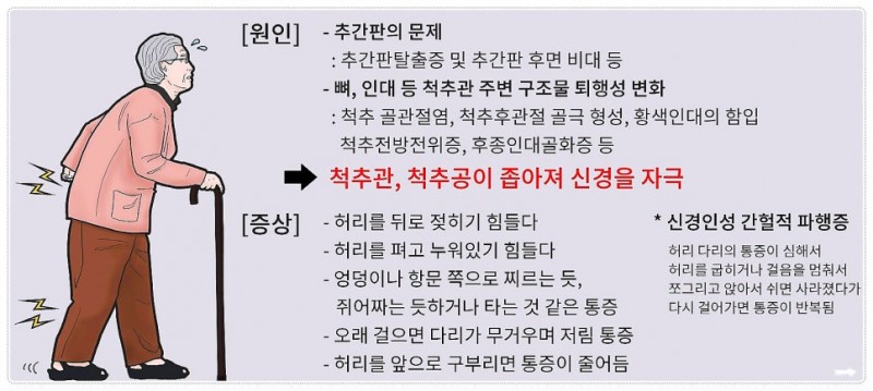 대표적인 원인으로는 황색인대 비후, 추간판 탈출, 척추 골관절염, 척추전방전위증 등이 있고요.