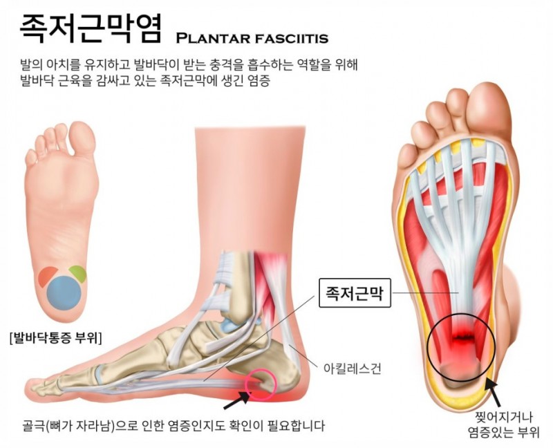 발뒤꿈치 아래쪽 근막에 미세한 손상과 염증이 생기면서