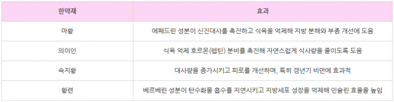 식욕 억제 작용: 자율신경계와 호르몬의 균형을 잡아줘서 적은 양으로도 포만감을 느낄 수 있어요. 마황에 들어 있는 에페드린 성분이 대표적이에요.