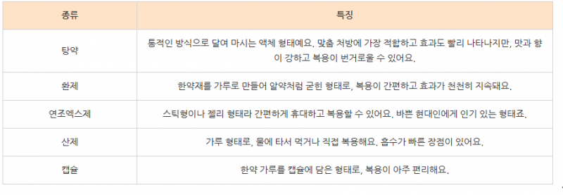 탕약: 개인 체질과 건강 상태에 따라 맞춤 조제가 가능하며, 흡수력과 효과가 빠른 편입니다.