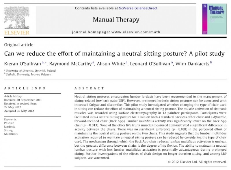 실험은 경사진 의자와 일반 의자에서 1분 동안 앉은 자세를 유지할 때, 척추 근육의 활성도를 비교하였습니다.