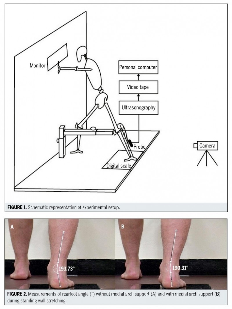 위의 논문자료는 일반 스트레칭을 했을때와, 발 내측 아치를 지지한 뒤 종아리 스트레칭을 했을때의 효과를 비교한 것입니다.