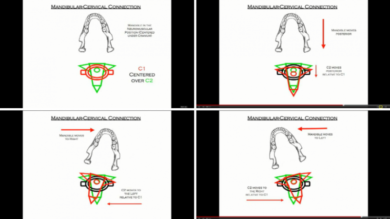위에 설명한 그림처럼 턱관절이 움직이면 경추도 따라 움직이게 됩니다. 이러한 경추의 변위는 주변 신경과 혈관을 압박하여 목통증을 유발합니다.