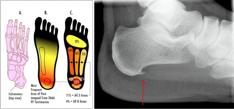 드물지만 발 뒤꿈치 뼈 부착부위에 뼈조각이 튀어나온 사람들 중 일부에서 발생하기도 합니다.