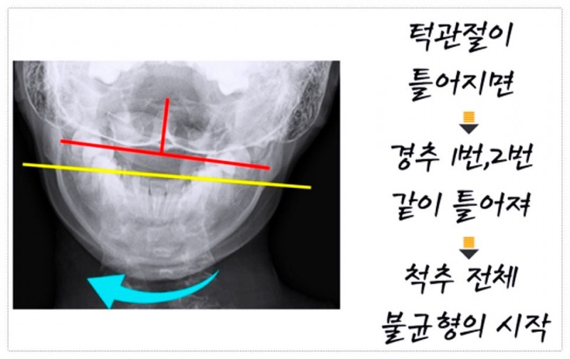기둥이 기울면 대문이 제대로 닫히지 않듯, 목뼈가 틀어지면 턱관절의 균형도 무너지게 되는 거죠.